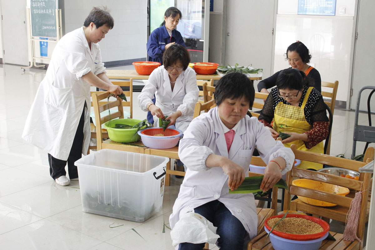 粽叶、糯米、肉、蛋黄等琳琅满目的包粽子材料整齐地摆放在长桌上,这些材料都是生活园区宿管阿姨们提前准备的,特别是粽叶还是从农田中新鲜采摘而来。长长的操作台旁挤满了兴趣盎然的同学们,宿管阿姨、保安阿姨则担任包粽子的指导老师,从粽叶的采摘、馅料的制作到最后粽子的出笼,每道程序都是由学生、老师和宿管阿姨们共同亲手制作完成。活动现场欢声笑语,洋溢着节日的气氛。只见学生们将粽叶卷成漏斗状后,用糯米充实压紧,再用细绳一绕、一捆,一个个可爱、鲜绿的“粽子”就这么诞生了。三个多小时的手工劳动,每个人都乐在其中,小小的粽子,在师生间架起了沟通的桥梁,拉近了彼此的距离。