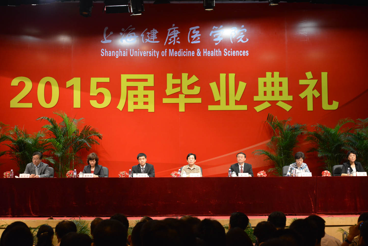 难忘三载同窗情,风雨相携共前行,上海健康医学院的首批毕业生即将离开母校,迈上人生新的征程。6月17日上午9点,上海健康医学院杨浦校区2015届毕业典礼在校区大礼堂隆重举行。上海健康医学院党委书记郑沈芳、校长黄钢、党委副书记李明磊、副校长曹蓉蓉、唐红梅、于莹、张道方出席毕业典礼。杨浦校区各部门负责人、海外合作院校代表、毕业生家长代表、校友代表、教师代表与杨浦校区2015届全体毕业生一同出席典礼。毕业典礼由上海健康医学院副校长曹蓉蓉主持。