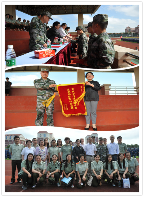 阅兵式后,郑沈芳书记宣读了荣获本次军训先进集体、优秀教官和优秀指导员等名单,并由台上领导颁发了荣誉证书。郑书记代表学校向承训部队领导赠送锦旗,感谢部队教官们卓有成效的工作。