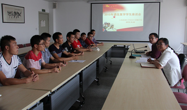 10月22日中午,医疗器械学院2015年退伍复学学生座谈会在杨浦校区6楼会议室召开。学院党总支副书记高晓霞、辅导员叶剑辉、2015年退役复学学生代表共18人参加了座谈会。