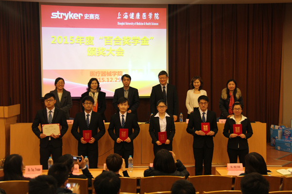 2015年12月29日下午,医疗器械学院第二届 “百合奖学金”颁奖仪式在杨浦校区学校报告厅隆重举行。史赛克(北京)医疗器械有限公司中国医疗设备部销售总监Gao Michael 、医疗设备部市场总监sai Karen等嘉宾及我校学生处副处长毛小燕、医疗器械学院党政领导、医械专业主任、获奖学生和医械专业大二、大三学生共计100余人参加此次会议。大会由医疗器械学院党总支副书记高晓霞主持。
