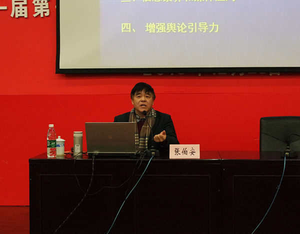 会上,张伯安运用了大量的基本原理、信息数据、社会热点、典型事件全面剖析了我们今天所处的新闻舆论新格局。从危机的涵义、危机事件的特征、危机的分类、公共危机案例以及危机管理与处置等方面深入全面地讲解了网络舆情危机和舆情管理。他指出舆论应对要坚持速报情况、慎报原因、缓说结论、由简入繁、增信释疑,要统一舆论口径,分阶段、分时间有的放矢地说话。面对舆情管理和媒体应对时,切实提高信息素养是重要基础,增强舆论引导力则更是关键所在。