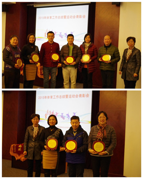 与会人员先后听取了校体委副主任凌文惠,校体育运动委员会执行委员会主任夏洪海关于2015年我校教职工、学生体育工作的开展情况和2016年的工作思路的汇报。工会专职副主席芦静宣读了教工运动会各项目的获奖名单;校体委副主任、运动会体育道德风尚奖评比委员会主任钱艳宣读了荣获本届运动会体育道德风尚奖的单位名单;校体委副主任徐迪宣读了荣获本届运动会团体总分前6名的学院名单(具体名单详见附件),并为获奖者颁奖。