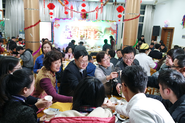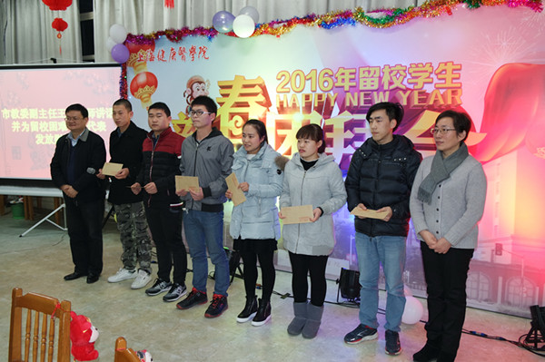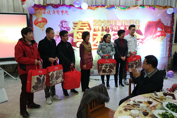 会后,校领导还慰问了为留校学生准备丰盛年夜饭的厨师们,对他们的精心准备、无私付出表示衷心的感谢。2016年留校学生春节团拜会在《难忘今宵》的歌曲中顺利落下帷幕。(学工部)