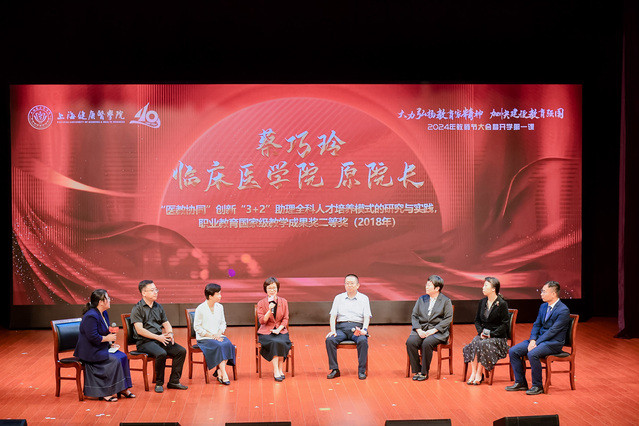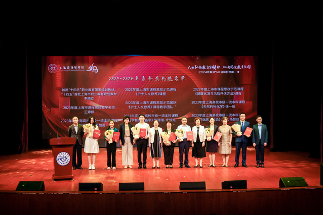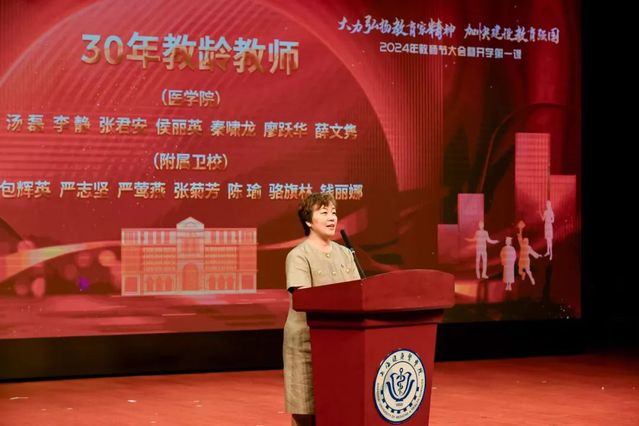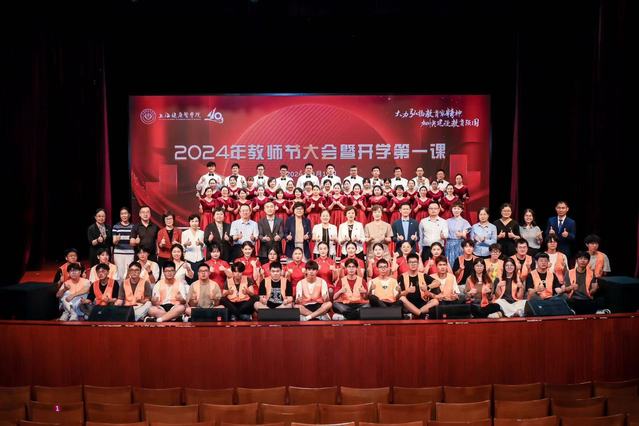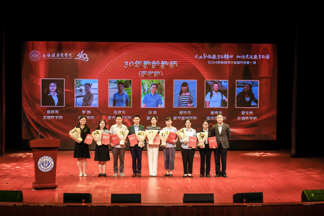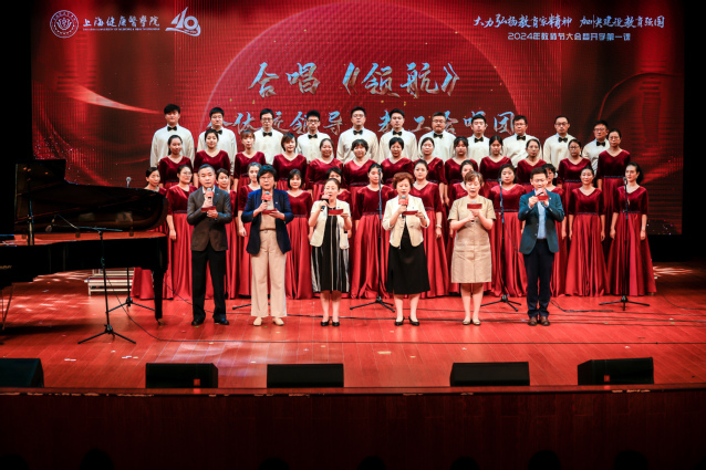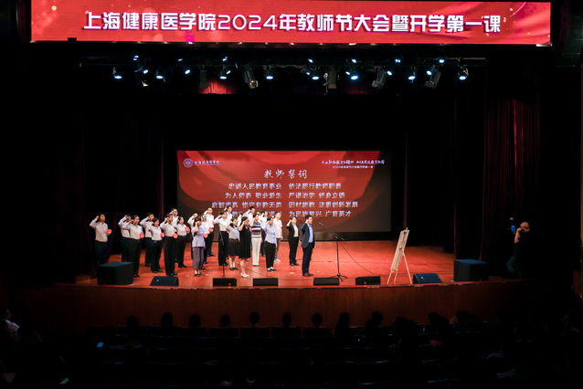 9月19日下午,上海健康医学院在北苑1号楼400人报告厅隆重举行“大力弘扬教育家精神,加快建设教育强国——上海健康医学院2024年教师节大会暨开学第一课”。大会分“立德树人 追求卓越”“薪火相传 心有大我”“教育强国 弘道追求”三个篇章,全体在校校领导、获奖教师代表、30年教龄教师、新进教师代表、全体中层干部、师生代表、附属卫校、附属医院、社区卫生服务中心代表、周浦实验学校代表欢聚一堂,全体师生在线上同步观看大会直播,共同庆祝第40个教师节。大会由刘一丹老师和季文譞同学主持。