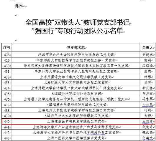 近日,教育部办公厅公布了全国高校“双带头人”教师党支部书记“强国行”专项行动团队名单,我校康复学院教工党支部成功入选。