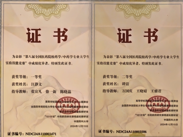 12月13日-15日,由教育部高等学校国家级实验教学示范中心联席会、全国药学类院校大学生专业技术与实验技能竞赛组委会、教育部药学课程虚拟教研室、101计划中药新药研究课程虚拟教研室、中国药科大学联合主办,成都中医药大学承办的“第八届全国医药院校药学/中药学专业大学生实验技能大赛”在四川成都落下帷幕。我校由药学院副院长孟祥国带队,指导教师代表张宜凡、万国庆随队,遴选2名优秀学子汪静文、谭倩参加此次技能展示并首次获全国一等奖1人,二等奖1人,实现了新突破!