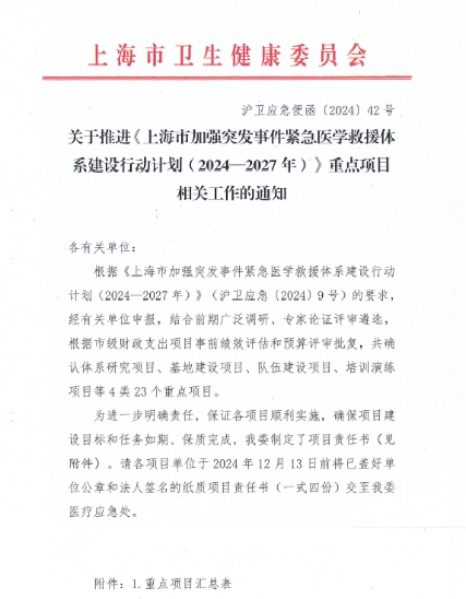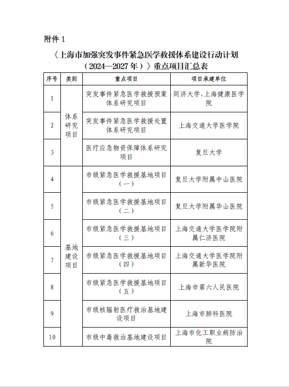 为加快打造与具有世界影响力的社会主义现代化国际大都市功能定位相匹配的突发事件紧急医学救援体系,进一步提升上海市的紧急医学救援能力与水平,市卫生健康委员会联合市教育委员会、市科学技术委员会、市财政局、市应急管理局、上海海事局、市中医药管理局、市疾病预防控制局于2024年8月制定并印发了《上海市加强突发事件紧急医学救援体系建设行动计划(2024—2027年)》(以下简称“三年行动计划”)。