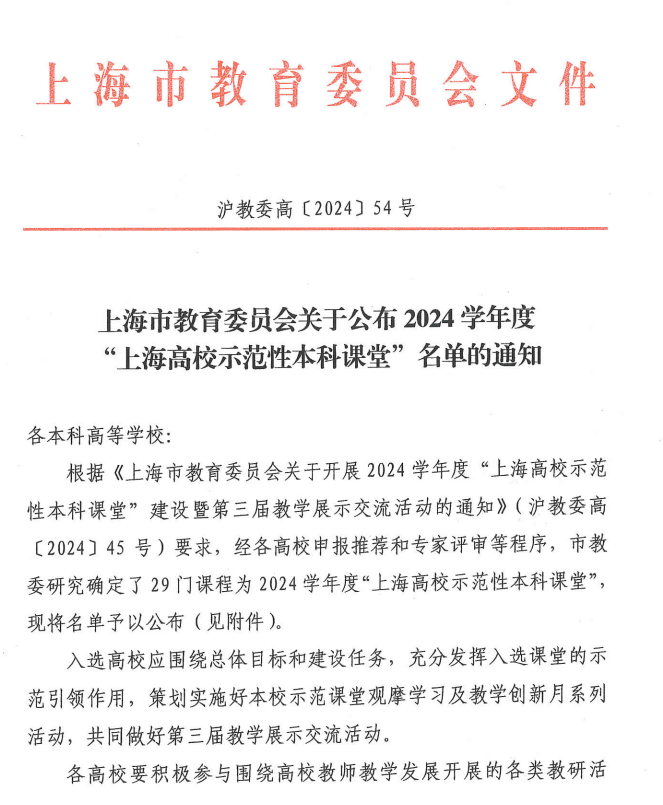 近日,市教委下发了《上海市教育委员会关于公布2024学年度“上海高校示范性本科课堂”名单的通知》(沪教委高〔2024〕54号),我校医学影像学院黄辰老师的《核医学》课程成功入选。