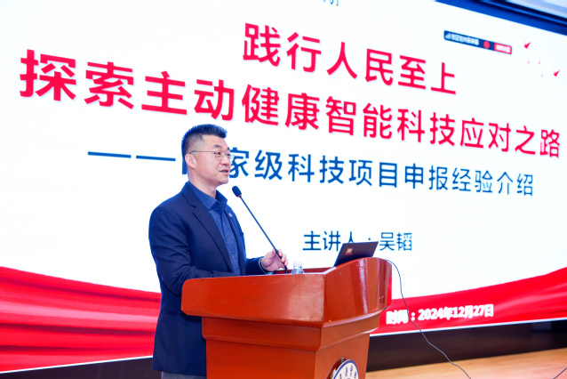 吴韬围绕“原点初心”“申报背景”“项目实践”“未来展望”四个方面分享了自己的学习之路、工作之路、研究之路。在“原点初心”部分,吴韬以自己的研学经历和援疆事迹鼓励引导教育科研人员面对困难和挑战时,要始终做到心怀“国之大者”,服务国之所需,无论是在教学一线还是在科研领域,都应以解决实际问题为出发点,以提高人民健康水平为己任。在“申报背景”环节,吴韬详细介绍了全球、中国和上海所面临的老龄化挑战,以及国家和上海对于科技创新和医疗健康领域的重视。他指出,随着社会的发展和人口老龄化的加剧,老年健康照护成为一个亟待解决的社会问题,而利用现代信息技术,将人工智能、区块链等先进技术与老年照护有机结合,可以为这一问题提供新的解决方案。在“项目实践”部分,吴韬回顾了自己2017年开始连续申报四次国家自然科学基金面上项目,最终才苦尽甘来获得立项,并作为首席科学家先后主持科技部和国家自然科学基金委员会重大专项,借此勉励各位科技工作者要坚持初心,坚韧不拔,围绕国家战略,拓宽国际视野,探索创新技术,持续提高研究能力。他强调,科研项目申报需要注重六个要素:一是目标远大、脚踏实地,努力组建高水平联合团队;二是多看政策、多读文献、多听新闻,稳妥把握研究目标;三是善啃硬骨头,能打攻坚战,精准设计技术路线;四是勤于学习、勇于创新,凝练提出若干先进理念;五是依靠团队、协同配合,打造可复制可推广项目经验;六是国际视野、合作共赢,构建人类卫生健康共同体。最后,在“未来展望”环节,吴韬展望了未来健康医疗领域的发展趋势,围绕发展新质生产力赋能中国式现代化,他指出,科技体制迎来新一轮重大变革,“健康”科技工作者要紧盯国家战略目标,关注重大科学前沿问题和研究的未来走向,有针对性开展项目分布受理与资助分析,紧随国家科技计划(专项、基金等)布局而开展有组织的科研,他鼓励在场的科研人员,凡是过往,皆为序章,所有将来,皆为可盼,健康人要敢于创新,勇于实践,不断探索科技与医疗健康相结合的新路径,为建设健康中国贡献力量。