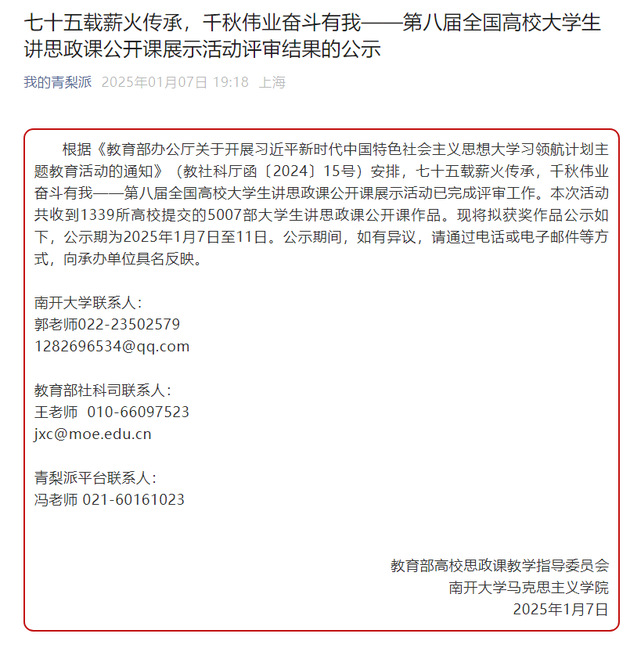 全国高校大学生讲思政课公开课展示活动由教育部高等学校思想政治理论课教学指导委员会主办,是习近平新时代中国特色社会主义思想大学习领航计划主题教育活动的一个活动主题,共收到全国1339所高校提交的5007部大学生讲思政课公开课作品,其中本科组设一等奖48个。