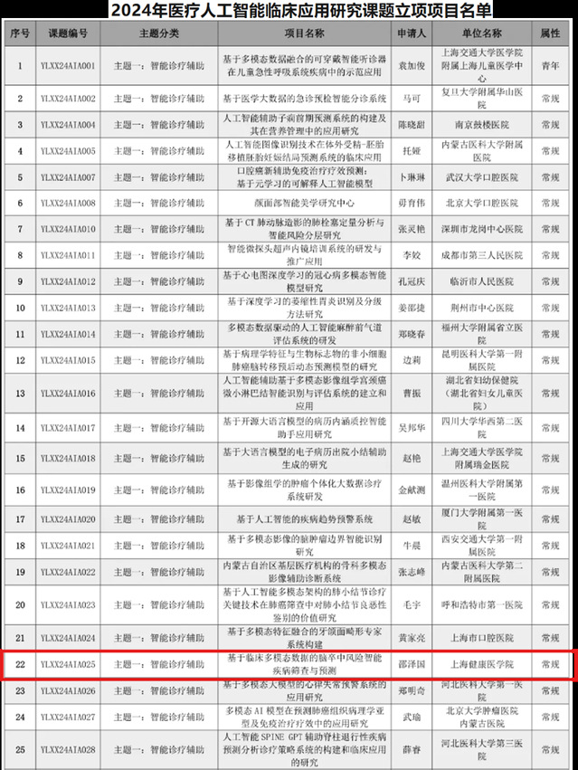 2025年1月23日,国家卫生健康委医院管理研究所公布了2024年度“医疗人工智能临床应用研究课题”立项名单,医疗器械学院教师邵泽国主持申报的课题“基于临床多模态数据的脑卒中风险智能疾病筛查与预测”成功获批立项。