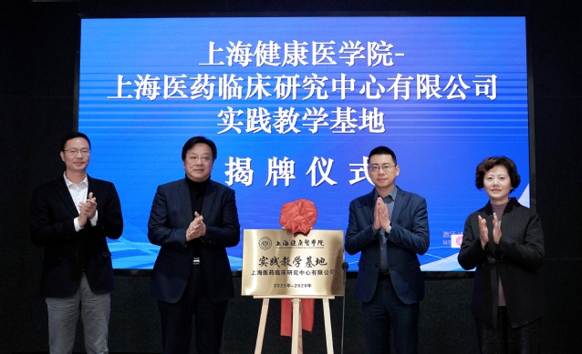 在唐红梅和罗华品等嘉宾和领导的共同见证下,张苏华、黄立波共同为“上海健康医学院-上海医药临床研究中心有限公司实践教学基地”揭牌。