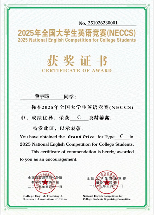 近日,我校临床医学院2024级学生蔡宇旸在教育部高教司批准举办规模最大、影响力最广的大学生英语赛事中,凭借扎实的语言功底和出色的临场发挥,从上海赛区41所参赛高校的选手中脱颖而出,在笔试和口试环节均表现优异,获得国家级特等奖。这是我校学生连续两年蝉联该项赛事的最高奖项。另有6名同学荣获国家级一等奖,他们分别是:临床医学院江咏轩、张佳怡,护理与健康管理学院方一欣,医学技术学院吴冯怡、仇天怡,以及健康与公共卫生学院张钰劼。