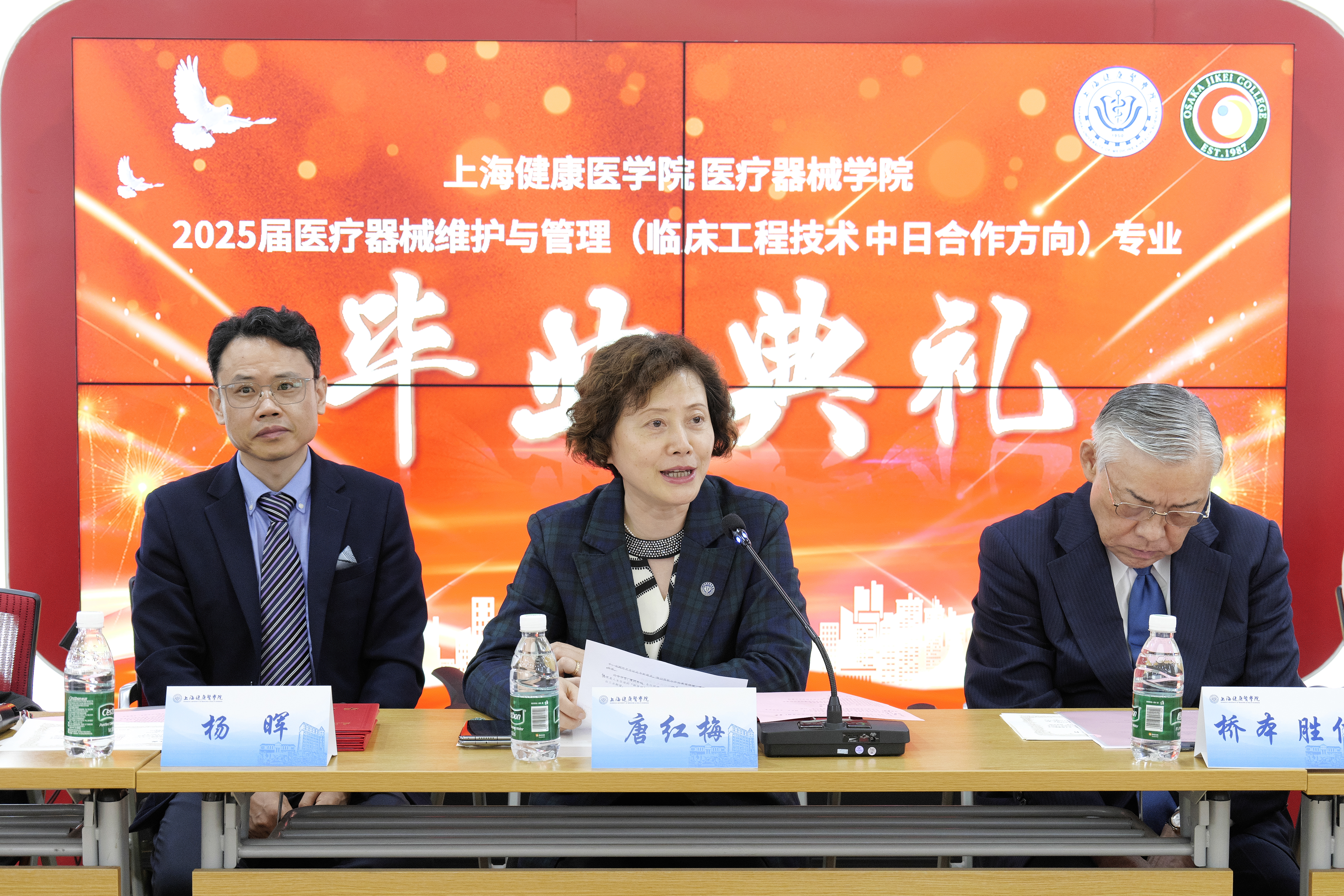 6月13日下午,医疗器械学院在北苑1号楼500会议室隆重举行了2025届医疗器械维护与管理(临床工程技术、中日合作方向)专业毕业典礼。31名毕业生圆满完成了学业,即将踏上人生新的征程。典礼现场庄重而温馨,师生齐聚一堂,共同见证这一重要时刻。校党委副书记、副校长唐红梅,日本大阪滋庆教育集团常务理事、校长桥本胜信先生,学生处处长童清、国际交流处副处长万广圣、教务处副处长蒋淑敏,医疗器械学院党总支书记郑学文、院长杨晖、党总支副书记杨美、副院长张欣和孙丽萍,以及医疗器械学院专业教师代表和辅导员代表出席毕业典礼。毕业典礼由临床工程技术专业主任陈正龙副教授主持。