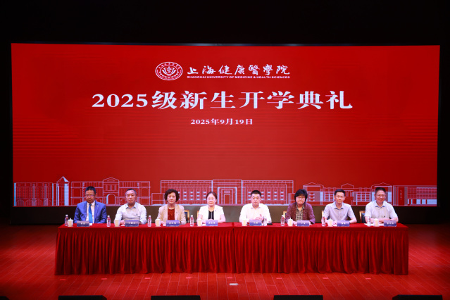 2025年9月19日,上海健康医学院2025级新生开学典礼暨开学第一课在北苑400人报告厅隆重举行。校党委书记郭永瑾,校长吴韬,党委副书记、副校长唐红梅,党委副书记于莹,副校长马耀良,副校长汤磊,附属周浦医院院长林研,附属公利医院副院长张登海,各附属医院代表,各学院主要负责人、职能部门负责人、新生辅导员和新生代表出席典礼现场。