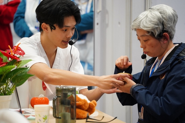 不同场景的照护中,闵思达的专业与温情更见细节:面对痴呆患者,他以低沉温暖的声线轻声安抚,帮助患者从紧张幻觉中回归现实世界,给予患者满满的安全感;照料截肢糖尿病患者时,他用坚定的鼓励话语帮患者重塑生活希望;在应对哮喘发作预防宣教时,他结合自身游戏经历与16岁小患者完美共情,让宣教更具感染力;在面对突发扭伤情况时,他凭借果断而娴熟的专业照护操作快速缓解患者不适。3天赛程、6个案例,他以“力量之刚”与“细腻之柔”,诠释了新时代男护士的独特的魅力和别样风采。