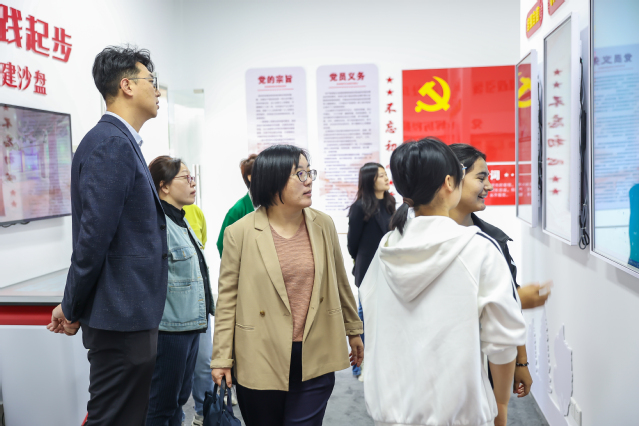 党建育人馆以“党建引领、服务学生、实践育人”为宗旨,包括数字模拟党建馆沙盘、党建知识AI问答、我校AI辅导员“健小爱”对讲平台、党的历次代表大会移动滑轨展示区、VR党建展馆体验、学生党建实践课程数字展播等。