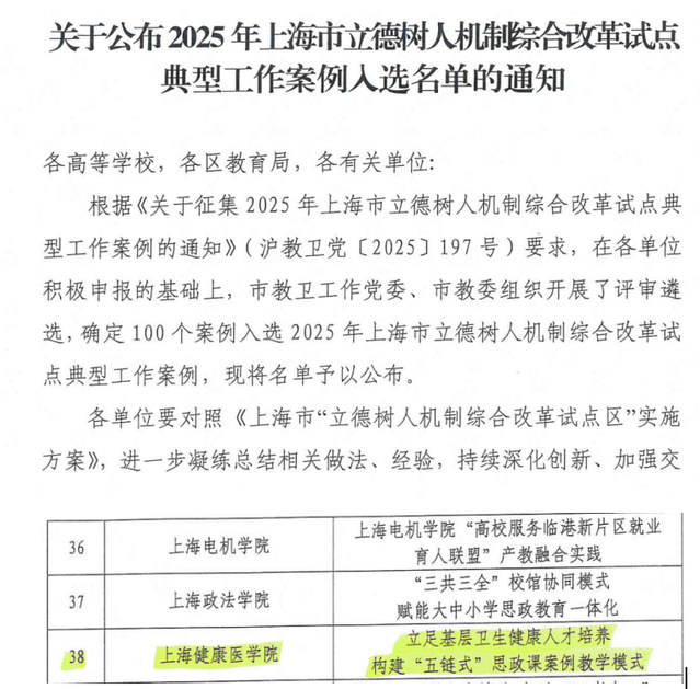 近日,中共上海市教育卫生工作委员会、上海市教育委员会公布了2025年上海市立德树人机制综合改革试点典型工作案例入选名单,由我校马克思主义学院报送的《立足基层卫生健康人才培养 构建“五链式”思政课案例教学模式》案例成功入选。此次案例入选是学校落实立德树人根本任务,持续深化新时代思政课改革创新的一项重要成果,是马克思主义学院推进以习近平新时代中国特色社会主义思想为核心内容的课程体系建设,努力打造“人民健康”2.0版思政大课实践探索的重要成果。