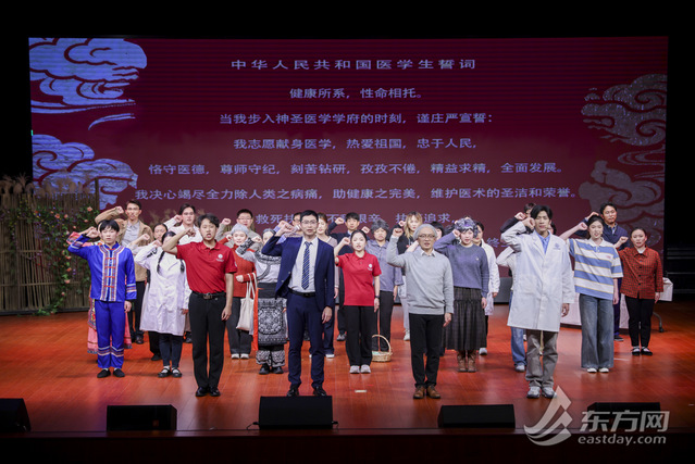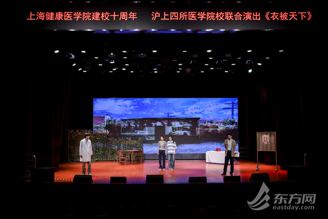 上海健康医学院北苑德馨楼剧场内座无虚席、掌声迭起——作为上海健康医学院建校十周年的重磅献礼之作,由上海健康医学院携手复旦大学上海医学院、上海交通大学医学院、上海中医药大学联合创排的医学人文话剧《衣被天下》近日在此隆重首演。演出以细腻的叙事、真挚的演绎,将中国医者的责任与担当、坚守与传承娓娓道来,生动展现了中国医疗卫生事业的发展脉络与医者精神的时代传承,为现场观众奉献了一堂沉浸式“医学思政大课”。