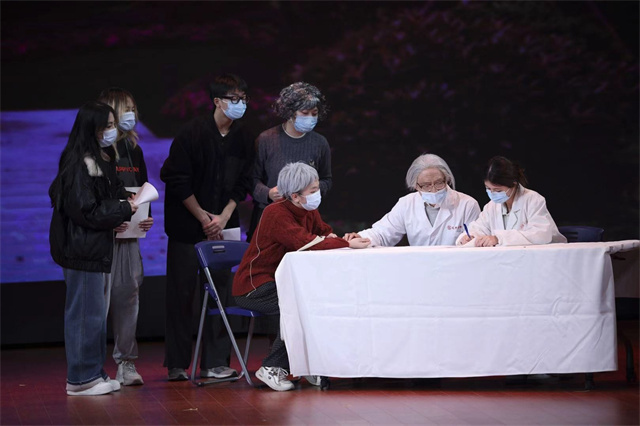 舞台上,袁满、周远航、张岚等青年学子的成长轨迹同样引人共鸣。从初入基层时的水土不服、对医学的刻板认知,到在前辈医者的感召下逐渐领悟“医学的真谛在于为人民健康服务”,青年们的思想碰撞与蜕变,直观呈现了医学教育中专业培养与人文塑造并重的重要性。当全体演员举起右手,庄严宣誓“竭尽全力除人类之病痛,助健康之完美”时,台下师生眼含热泪,经久不息的掌声既是对演出的认可,更是对自身职业初心的重温与确认。