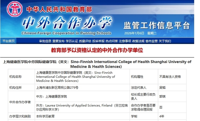 据介绍,中芬学院首批开设康复物理治疗、数据科学与大数据技术两个专业,开展本科层次学历教育,学制4年,采用“4+0”模式。两个专业每年各招收80人,纳入国家普通高等学校招生计划。学生完成学业,符合毕业及学位申请要求的学生,可同时获得上海健康医学院本科学历证书及学士学位证书,以及芬兰拉瑞尔应用科学大学医疗保健学士学位或工商管理学士学位。专业设置对接上海市及长三角地区区域经济与大健康产业发展。