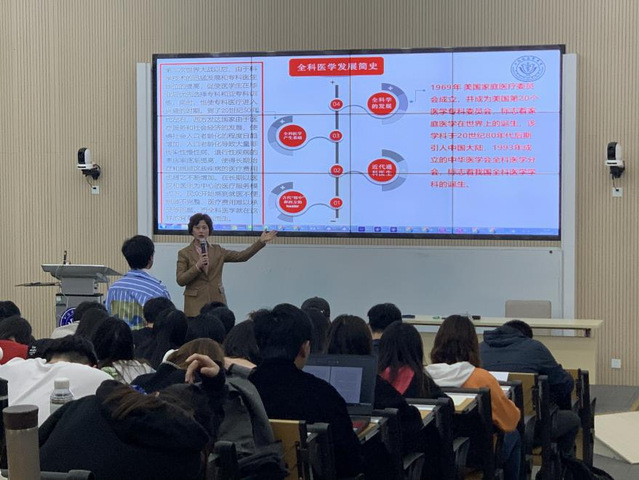 课程伊始,唐红梅在对全科医学、全科医疗、全科医生和全科医疗服务模式等内容进行讲授之前,首先与同学们一起回顾了全科医学发展的历史,让同学们认识到全科医学发展之于健康中国战略的重要性,也让同学们深深体会到习近平总书记在全国党史学习大会上所强调“学史明理、学史增信、学史崇德、学史力行”的重要意义,同时也启发在座学子思考“如何成长为一名合格的新时代全科医生”。