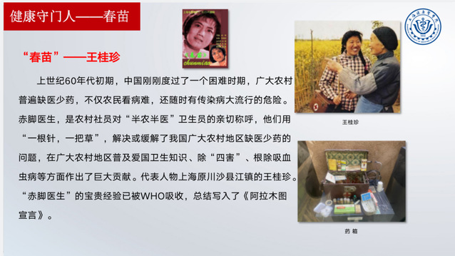 随后,唐红梅在“健康上海行动”“健康‘守门人’守健康”两个板块,介绍了我国全科医学发展的实践探索,特别是上海市近年来在全科医学发展上所进行的实践探索以及所取得的成绩,让同学们认识到虽然全科医学在中国的发展历史不够长,但在数十年中其趋势已经逐渐凸显出来。紧接着,唐红梅向同学们介绍了最早的全科医生代表人物上海原川沙县江镇的王桂珍。通过对王桂珍老人数十年“赤脚医生”经历的回顾,让在座青年学子领略早期全科医生的岁月点滴,体味医者的初心使命。