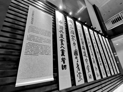 展览分为东西两面展墙,西面墙以大幅书法四条屏书写《中国共产党入党誓词》,东面墙由36幅红色金句书法构成巨幅矩阵。端庄秀丽的楷书、如行云流水的行书、奔放飘逸的草书,风格各异,但字字我手写我心。