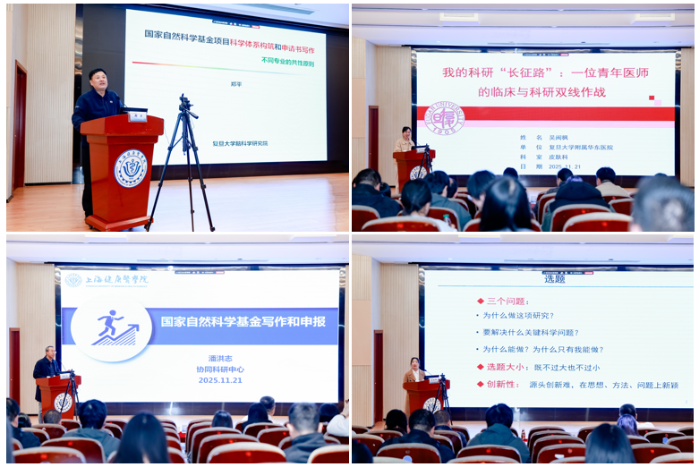 国家自然科学基金二审专家、复旦大学脑科学研究院郑平教授在培训会上作了《国家自然科学基金项目科学体系构筑和申请书写作——不同专业的共性原则》的讲座。上海市启明星(A类)、上海市医苑新星华东医院吴闽枫博士以《我的科研“长征路”:一个青年医师的临床与科研双线作战》为题,分享了科研结合临床的经验。