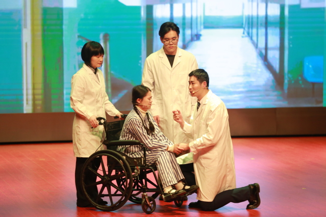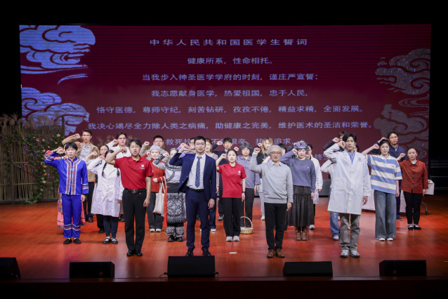 《衣被天下》不仅是一场艺术演出,更是一次面向医学生的生动思政教育。剧中通过袁满、周远航、张岚等青年学子的思想碰撞与成长蜕变,直观展现了医学教育中专业培养与人文塑造并重的重要性。当剧中人物从困惑、挣扎到感悟、坚定,领悟到“医学的真谛在于为人民的健康服务”,最终举起右手庄严宣誓“竭尽全力除人类之病痛,助健康之完美”时,台下不少师生眼含热泪,掌声经久不息。这既是对剧中人的认可,更是对自身职业初心的重温与确认。