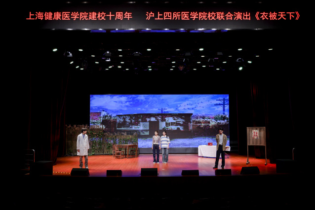 2025年12月10日,上海健康医学院北苑德馨楼剧场内座无虚席、掌声迭起——作为上海健康医学院建校十周年的重磅献礼之作,由上海健康医学院携手复旦大学上海医学院、上海交通大学医学院、上海中医药大学联合创排的医学人文话剧《衣被天下》在此隆重首演。演出以细腻的叙事、真挚的演绎,将中国医者的责任与担当、坚守与传承娓娓道来,生动展现了中国医疗卫生事业的发展脉络与医者精神的时代传承,为现场观众奉献了一堂沉浸式“医学思政大课”。