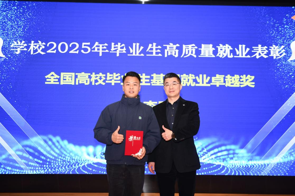 为表彰先进、树立榜样,进一步激发全校就业工作积极性,会上同时对2025年为就业作出突出贡献的个人和集体进行了表彰。校长吴韬为荣获“2024—2025年度全国高校毕业生基层就业卓越奖”的护理与健康管理学院毕业生边李园(现就职于上海市崧泽强制隔离戒毒所,四级警长)颁发荣誉证书。学校始终高度重视基层就业引导工作,学生积极响应国家“到基层去、到西部去、到祖国最需要的地方去”的号召,扎根基层、服务社会。